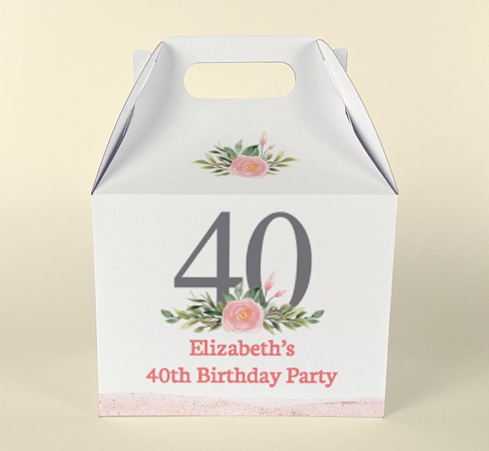 Easily add your own details to make your 40th pink flower party boxes truly personal.