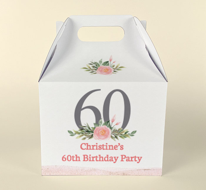 Easily add your own details to make your 60th pink flower party boxes truly personal.