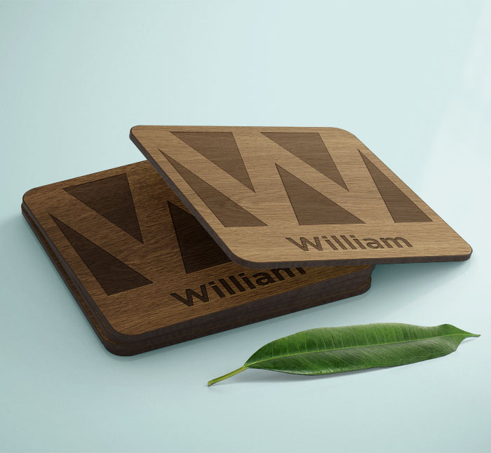 These quality personalised initial letter w laser cut wooden coasters are individually laser cut from Oak Veneered MDF. They are 4mm thick and measure 95mm square with round corners.