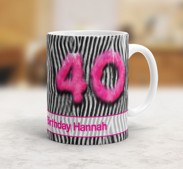Easily add your own details to make your personalised pink furry 40th mug truly personal.