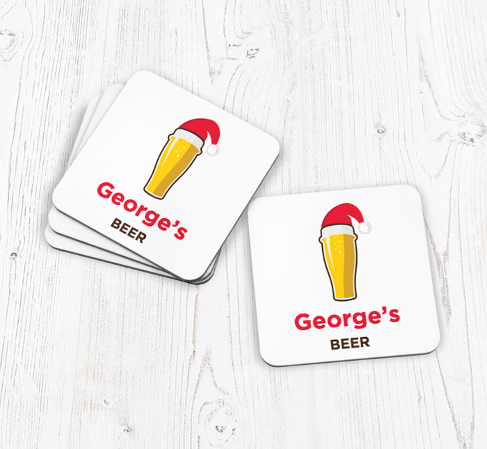 Easily add your own details to make your personalised santa hat on beer coasters truly personal.